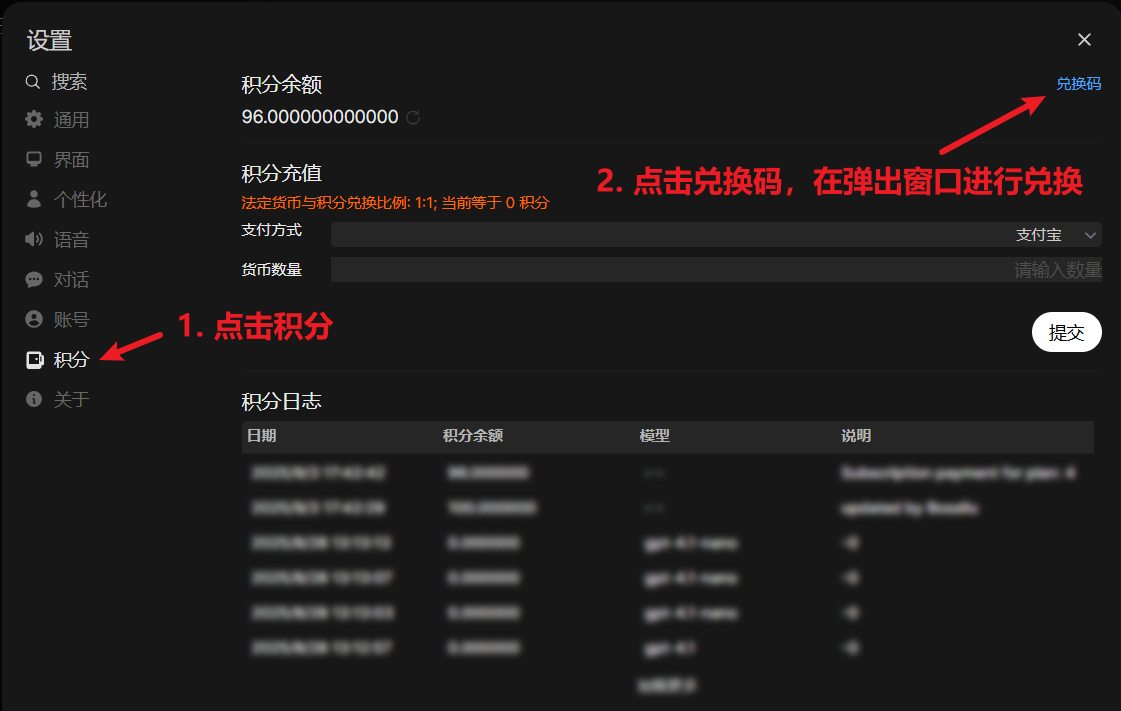 使用说明:点击 左下角头像-设置,通过以下方式打开充值界面,填入兑换码完成充值